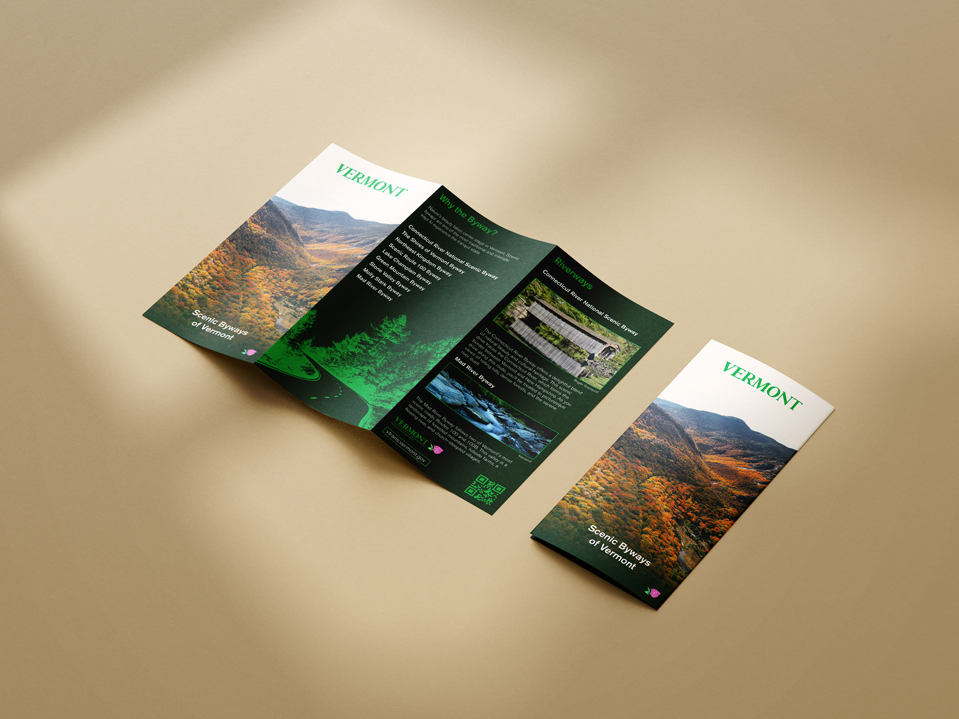 A brochure advertising Vermont's scenic byways. Pamphlets like this one are common to see at rest stops and local stores, and offer an excellent opportunity to establish consistent branding in print.